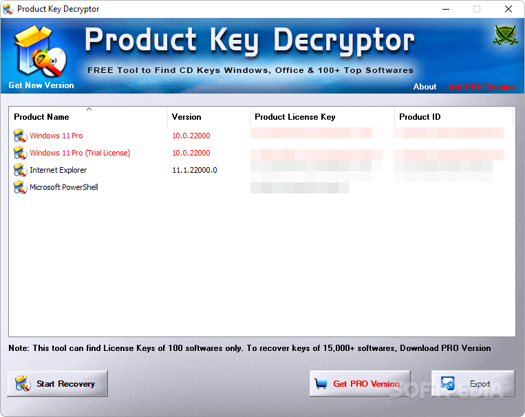 Easy to use: Just click Start and Recovery, and Product Key Decryptor will display the license keys for the software it finds on your computer.